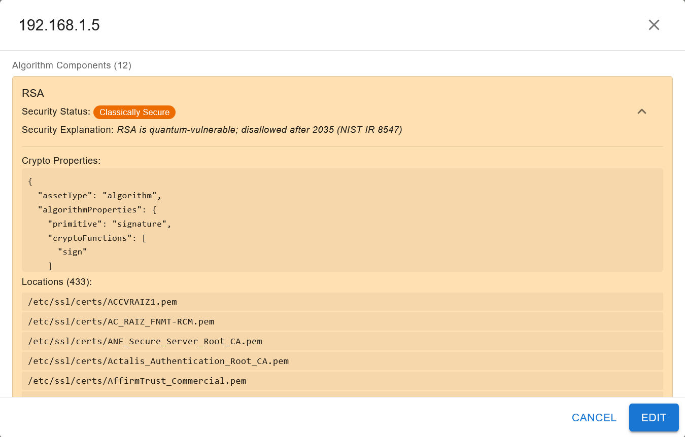 a detailed breakdown of all the algorithm components found in the CBOM and whether they are quantum secure, classically secure or insecure as shown in the image below: