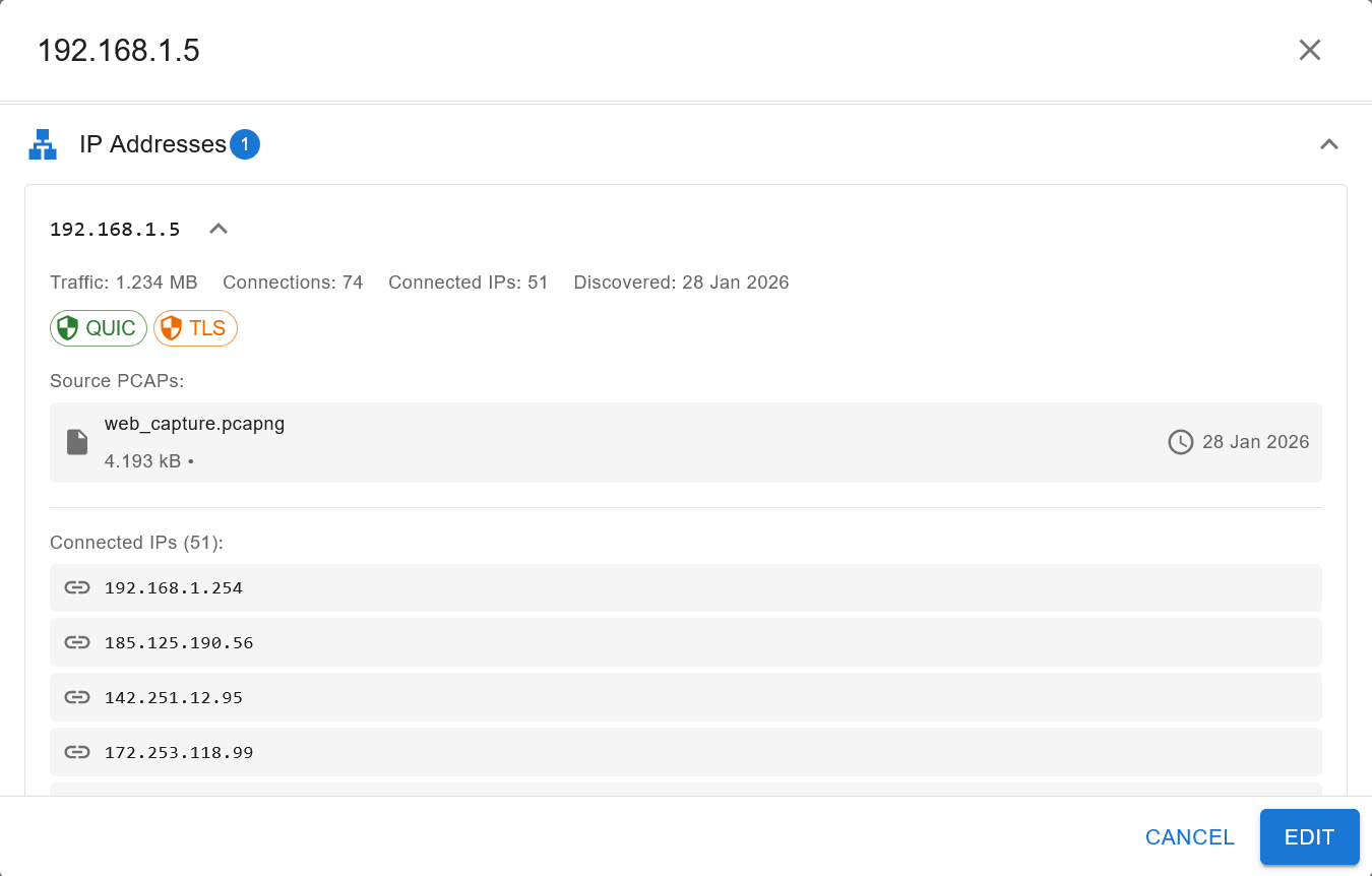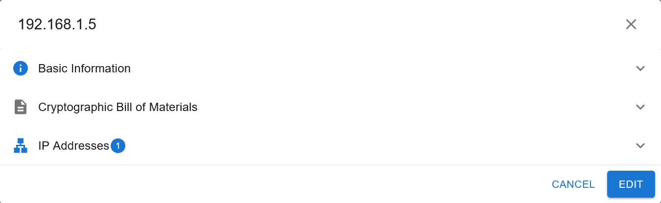 An overview of each asset containing: - asset name or IP address (if no asset name) - number of IP addresses tagged to the asset - total amount of traffic recorded as passing through the asset across all its IPs - number of connections associated with the asset - any analyzed crypto protocols captured in the IPs tagged to the asset - CBOM uploaded to the asset - Number of pcap file sources for the asset