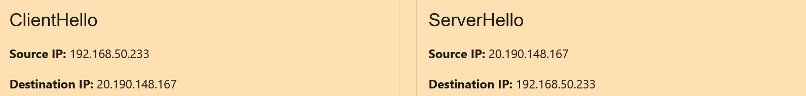 Both the ClientHello and ServerHello have Source IP and Destination IP fields. The difference lies in order of the IP addresses shown. In the ClientHello, which is the client to server part of a TLS/QUIC connection, the client IP is shown as the Source IP and the server IP is shown as the Destination IP typically. In the ServerHello, the opposite is true, as it is the server to client part of a TLS/QUIC connection. An example of this dichotomy is shown below:
