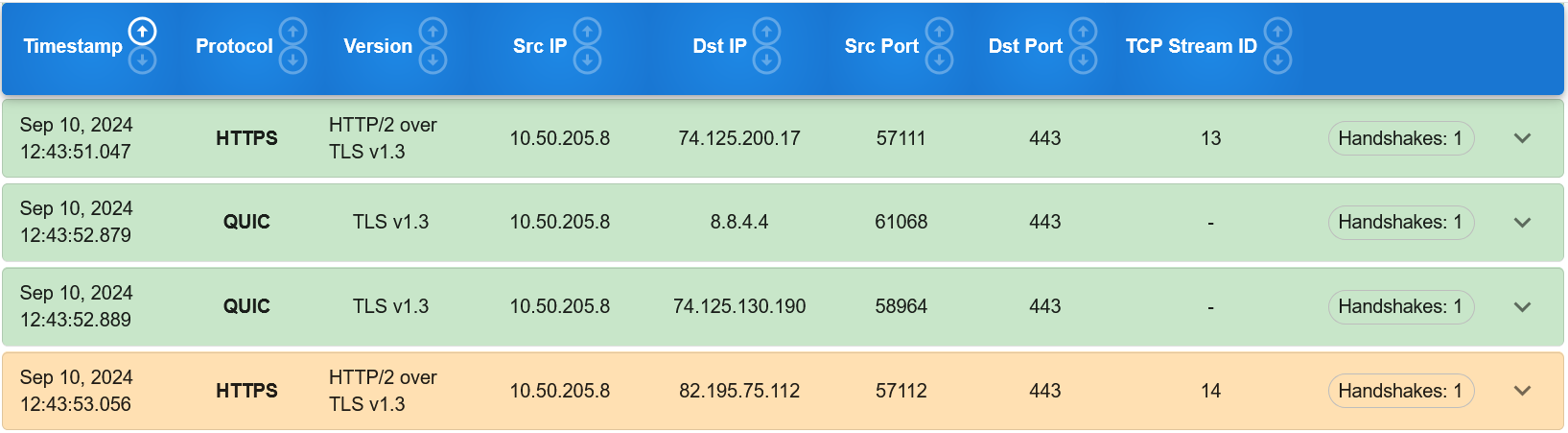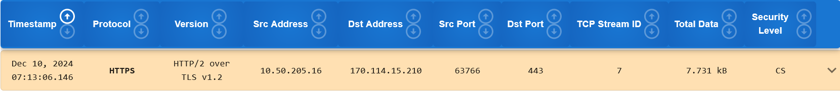 At the right side of the card header, is an arrow icon pointing downward. Clicking on it will cause the arrow to point upwards and simultaneously, show a dropdown below that specific row. The dropdown shows a detailed view of the cryptographic protocol for the connection.