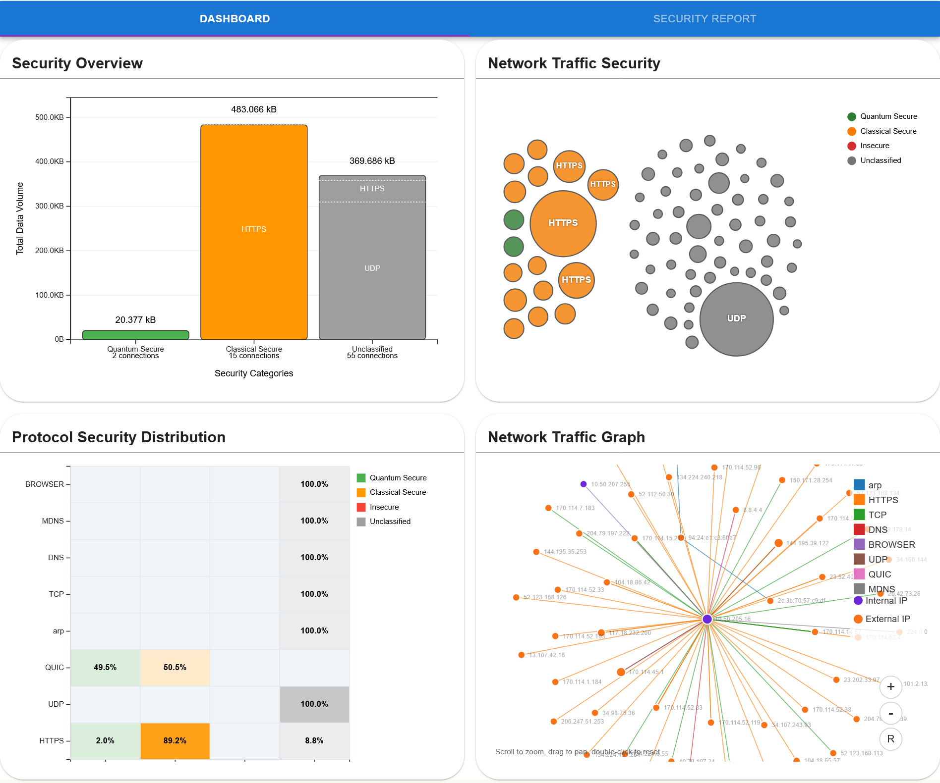 The Security Overview and Network Traffic Security graphs will show the general quantum secure posture of the network, while the Protocol Security Distribution and Network Traffic graphs show the more minute details of the network topology.