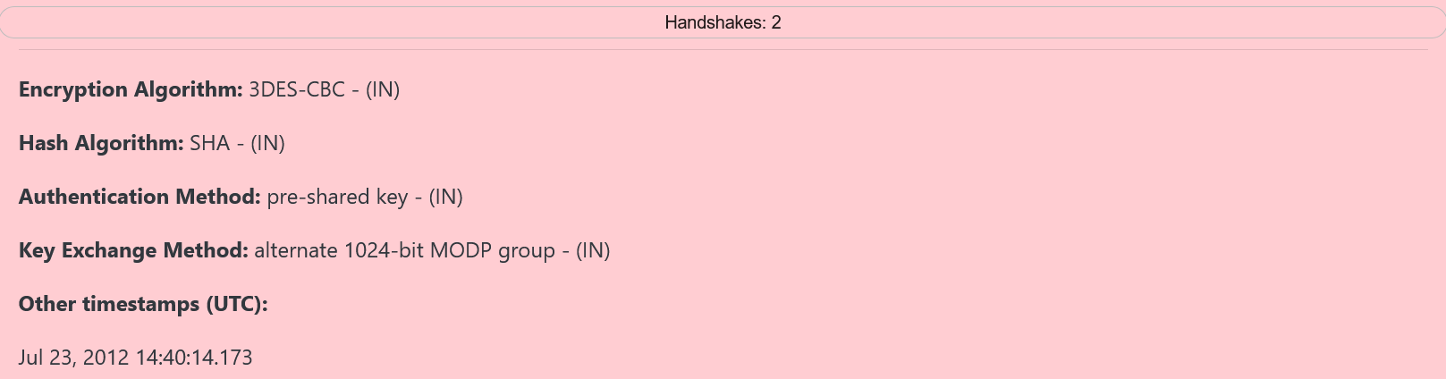 The detailed view for IPsec consists of header containing the number of Handshakes for the IPsec connection as well as four algorithm fields and an optional Other timestamps (UTC) field, containing a vertical list of timestamps, which is shown if there is more than one handshake. The four algorithms shown differ based on IPsec version.