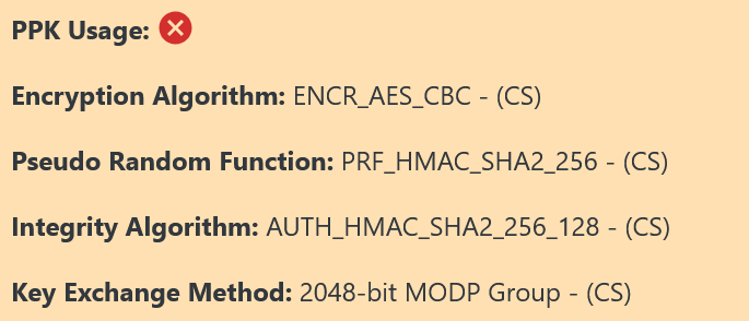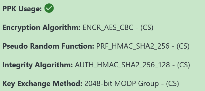 The PPK Usage field will either show a red cross or green tick icon, indicating the use of PPK (Post-quantum Preshared Key) in the connection and not, respectively. The usage of PPK for the IPsec connection is a direct indicator of the quantum security for the connection.