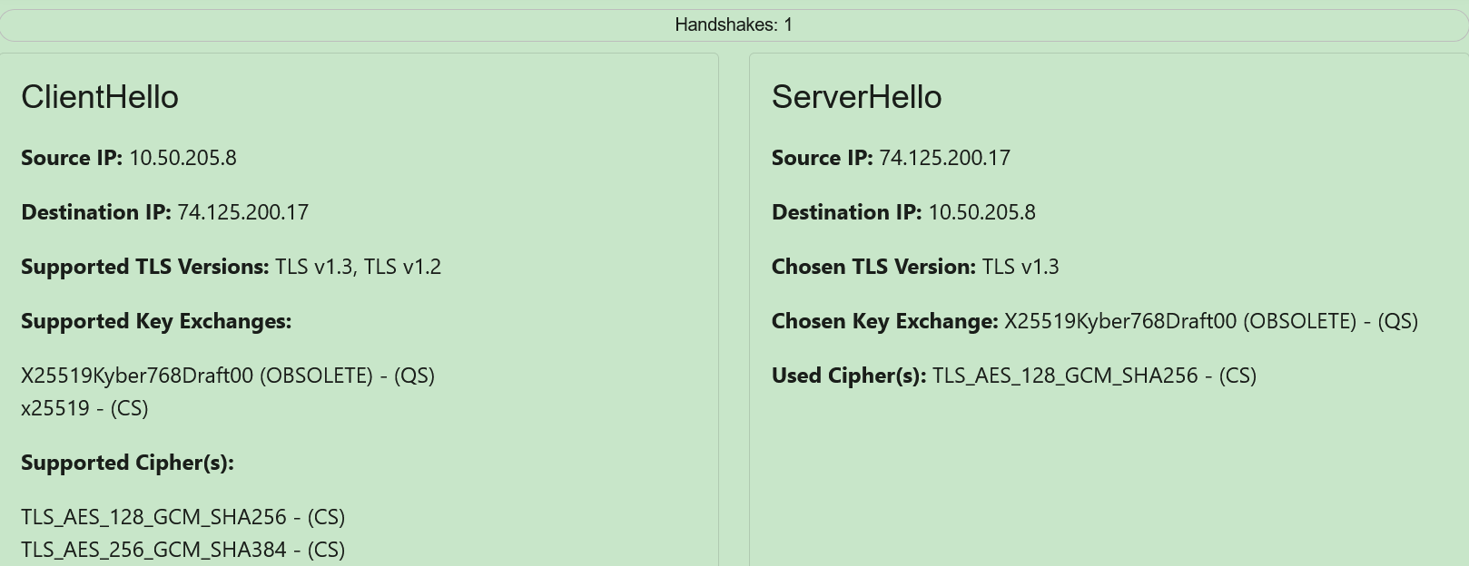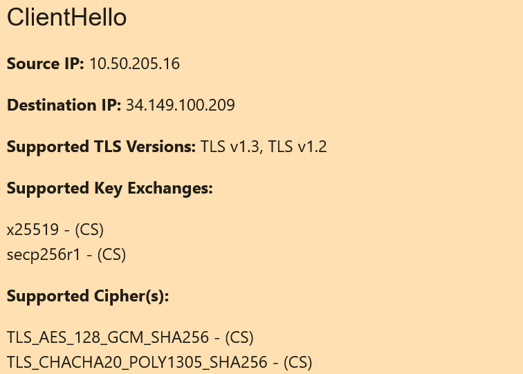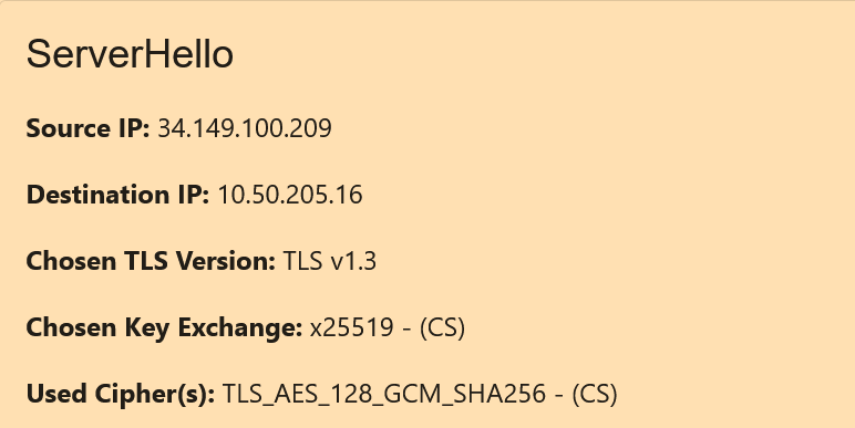 Similarly, due to the architecture of QUIC (QUIC only uses the latest version of TLS, which is TLS v1.3), the ServerHello card for a QUIC connection will always have a Used Cipher field and a Chosen Key Exchange field.