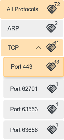 When one the parent sidebar tabs are clicked, only the connections for the protocol are shown. To expand the parent tab, click on the arrow icon. Clicking on the child tabs will filter out the connections of the transport protocol for the port shown on the tab.
