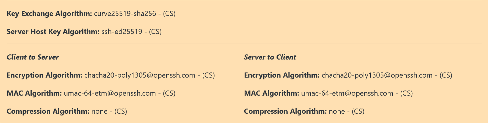 The second section which is directly below the first section, is split into 2 columns. The first column contains the algorithms for traffic going from client to server. The second column contains the algorithms for traffic going from the server to the client. In both cases, the 3 algorithms shown in each column are: